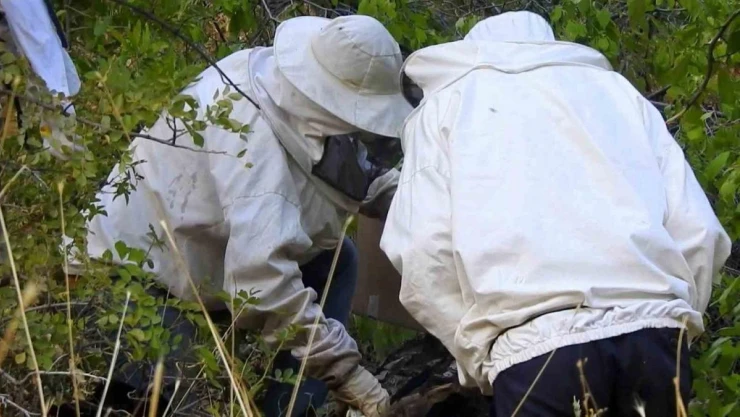 Erzincan’da kovanlardan ayrılıp kuru ağaç gövdesi ve kayalıklara yuva yapan arıların yaptığı ballar, su kenarlarında takip ettikleri arıların yuvasına ulaşan bal avcıları tarafından çıkarılıyor.
