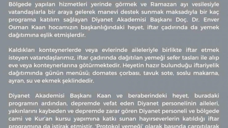 “Diyanet Akademisi Başkanı Kaan ve beraberindeki heyet, buradaki programın ardından, depremde vefat eden Diyanet personelinin aileleri, yakınlarını kaybeden ve depremde zarar gören Diyanet personeli ve bölgede cami ve Kur’an kursu yapımına katkı sunan hayırseverlerin katıldığı iftar programına da iştirak etmiştir. ‘Protokol yemeği’ olarak basında çarpıtılarak yer alan habere konu yemek menüsü ise; diğer menüyle benzer şekilde mercimek çorbası, sebzeli yemek, salata, tatlı, ayran, su ve ekmek şeklindedir.”