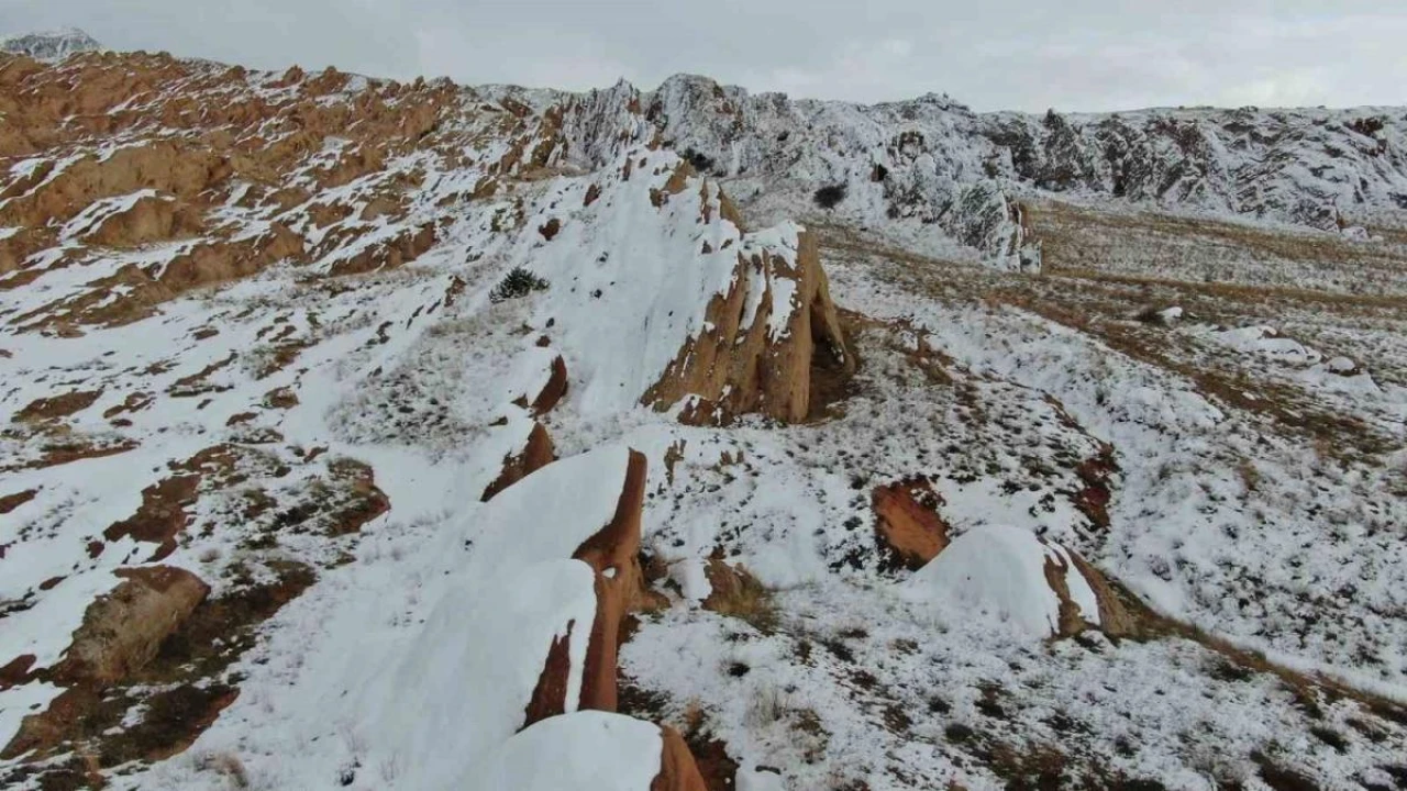 Sivas’ta rengi ve yapısıyla ’Dünyadaki Mars’ olarak adlandırılan Eğribucak kayalıkları, yağan karla beyaza büründü.
