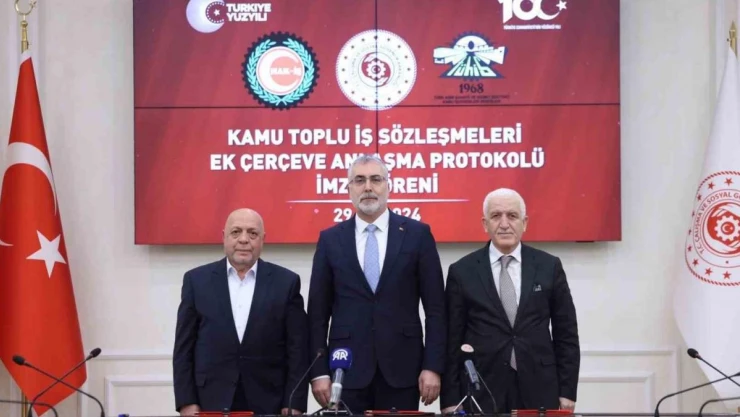 Çalışma ve Sosyal Güvenlik Bakanlığı ev sahipliğinde Türkiye İşçi Sendikaları Konfederasyonu (TÜRK-İŞ) ve Hak İşçi Sendikaları Konfederasyonu (HAK-İŞ) ile Kamu Toplu İş Sözleşmeleri Ek Çerçeve Anlaşması Protokolü imzalandı. Kamu işçilerinde enflasyon ve ücret zammının toplamından oluşan oranın yüzde 32,57 olarak uygulanmasını içeren ek protokol imza törenine Çalışma ve Sosyal Güvenlik Bakanı Vedat Işıkhan ve TÜHİS Genel Sekreteri Adnan Çiçek katıldı. Bakan Işıkhan, törende yaptığı konuşmada 2023-2024 dönemini kapsayan Toplu İş Sözleşmesi Çerçeve Anlaşma Protokolü’nün 9 Mayıs 2023’te imzalandığını hatırlatarak, “Bu kapsamda işçilerimizin aylık brüt çıplak ücretlerini 15 bin liraya yükseltmiştik. Ayrıca bu 15 bin lira ücretin üzerine 2023 yılı ilk altı ayı için refah payı dahil olmak üzere yüzde 45 oranında zam yapılmış ve diğer kalemlerde de iyileştirmeler gerçekleştirilmişti. Bu dönemde işçi konfederasyonlarımız ve sendikalarımızın tam bir mutabakatıyla toplu iş sözleşmesini imza altına almıştık” ifadelerini kullandı.