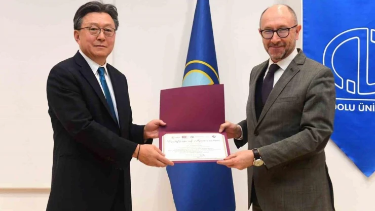 Konferansın sonunda Anadolu Üniversitesi Rektörü Prof. Dr. Fuat Erdal ve Eğitim Fakültesi Dekanı Prof. Dr. Erkan Dinç tarafından Dr. Jongwoo Han’a teşekkür belgesi ve hediye takdimi yapıldı.