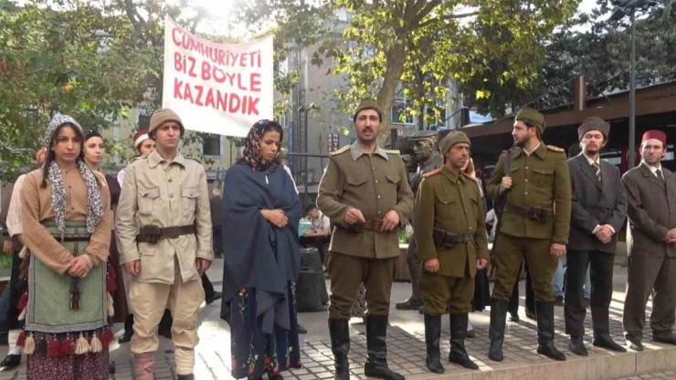 Altınordu’da kentin çeşitli mevkilerinde sergilenen etkinlikte oyuncular Milli Mücadele’nin ve Türkiye Cumhuriyeti’nin hangi şartlarda kurulduğunu gösteri olarak sahnelediler.