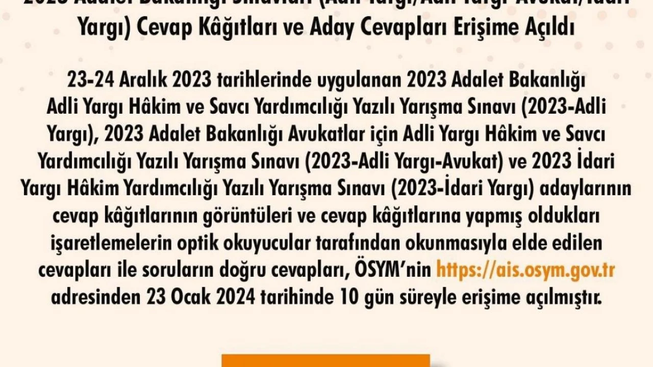 ÖSYM, resmi internet sayfasından yaptığı duyuruda, 23-24 Aralık 2023 tarihlerinde uygulanan 2023 Adalet Bakanlığı Adli Yargı Hakim ve Savcı Yardımcılığı Yazılı Yarışma Sınavı, 2023 Adalet Bakanlığı Avukatlar için Adli Yargı Hakim ve Savcı Yardımcılığı Yazılı Yarışma Sınavı ile 2023 İdari Yargı Hakim Yardımcılığı Yazılı Yarışma Sınavı sonuçlarının açıklandığını paylaştı.