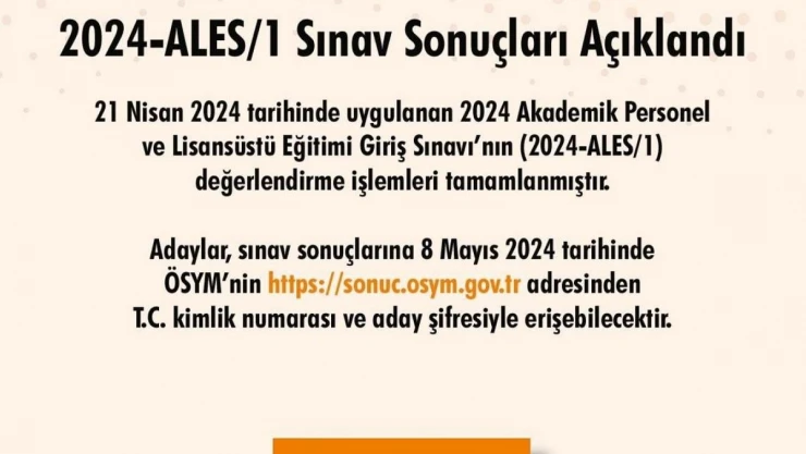 Ölçme, Seçme ve Yerleştirme Merkezi (ÖSYM), 2024 Akademik Personel ve Lisansüstü Eğitimi Giriş Sınavı (2024-ALES/1) sonuçlarının açıklandığını bildirdi.