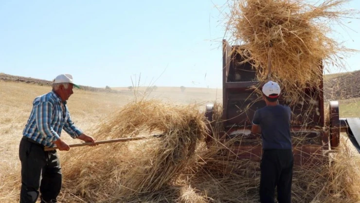Bir taraftan tarladaki ürününü toplayan köylüler, diğer taraftan da topladığı arpa ve buğdayı traktörün arkasına bağladığı patosa atarak, saman ve arpasını ayırıyor.