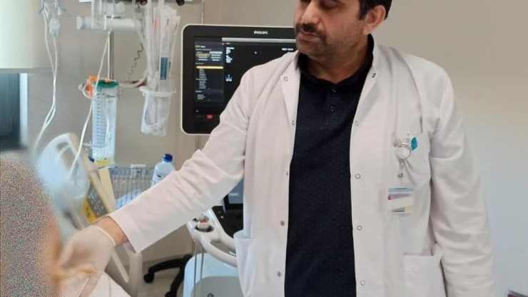 USG eşliğinde torasentez işlemini gerçekleştiren Göğüs Hastalıkları Uzmanı Dr. Öğr. Üyesi Cebrail Azar, “Zatürre tanısı ile yatırdığımız 90 yaşındaki bayan hastamızın akciğerlerinde sıvı gelişmesi vardı. Bu sıvı enfeksiyon değerleri düştükçe eğer gerilemiyorsa enjektör yöntemiyle akciğer zarından sıvıyı alıyoruz. Bu işlemle hastamızın tedavisini sağlamış oluyoruz. Torasentez, akciğer zarları arasında biriken sıvının göğüs kafesinden enjektör vasıtasıyla alınması işlemidir. Akciğer zarlarından ultrason eşliğinde sıvı alma işlemi, işleme bağlı gelişecek komplikasyonları yani riskleri en aza indirmektedir. Akciğer zarlarından sıvı alırken akciğer zarının içine kanama olabiliyor. Akciğer zarları arasına hava kaçabiliyor ama ultrason eşliğinde olunca bu oran binde birinin altına iniyor. Daha önce körlemesine yapılıyordu yani muayene sırasında muayene bulgularıyla akciğer zarı arasından sıvı alınıyordu. O durumlarda riskler artabiliyor. Şimdi bu hastamızda biz ultrason eşliğinde sol taraftan yaklaşık 20 CC miktarında bir sıvı aldık. Aslında daha önce kalp yetmezliği olduğu için sıvının görüntüsü enfeksiyon ile uyumlu olduğunu bize düşündürttü. Bununla ilgili tabii ki çeşitli enfeksiyon parametrelerine bakıyoruz.” dedi.