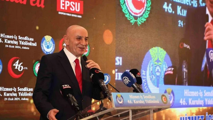 HAK-İŞ Konfederasyonu ve HİZMET-İŞ Sendikası 46’ıncı kuruluş yıldönümü kapsamındaki etkinlikte konuşan Cumhur İttifakı Ankara Büyükşehir Belediye (ABB) Başkan Adayı Turgut Altınok, "Biz tabii birileri gibi söz verip sonra o sözünü tutmayanlardan değiliz. Ankara Büyükşehir Belediyesinde çalışan hiçbir işçimizin ekmeğiyle oynamayacağız" dedi.