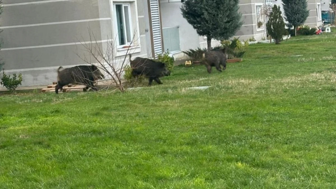 İstanbul Çatalca'da aç kalan domuzlar bir siteye girdi. O anlar vatandaşların cep telefonu kamerasına yansıdı.