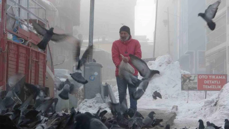 Ardahan’da dondurucu soğuklar etkisini sürdürürken, kar yağışı nedeniyle yem bulamayan güvercinleri esnaf besliyor.