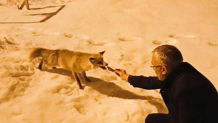 Ardahan'da kar yağışı ve soğuk hava nedeniyle yiyecek bulamayan tilki, Arıcılık Gen Merkezine misafir oldu. Gen Merkezi Müdürü Sinan Aydın aç tilkiyi elleriyle besledi.