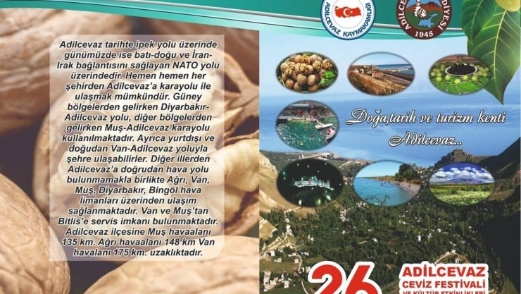 Bitlis’in Adilcevaz ilçesinde belediye ve kaymakamlığın organizesiyle “26. Adilcevaz Ceviz Festivali ve Kültür Etkinlikleri” düzenlenecek.