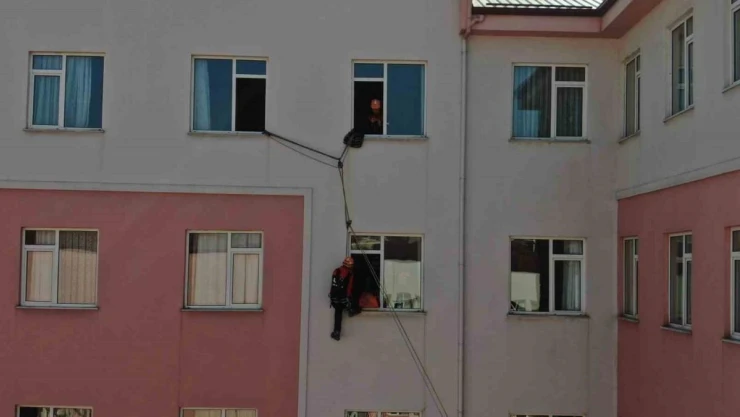 Trabzon’da İl Afet ve Acil Durum Müdürlüğü (AFAD) öncülüğünde 1-7 Mart Deprem Haftası nedeniyle bir okulda deprem tatbikatı gerçekleştirildi. Tatbikatta, bir öğrenci senaryo gereği mahsur kaldığı okul binasının en üst katından halatlar yardımıyla kurtarıldı.