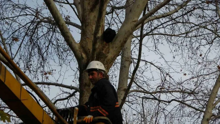 Adana’nın Kozan ilçesinde bir çınar ağacında 3 gündür mahsur kalan kedi, park bahçe ekiplerinin fark etmesi üzerine kurtarıldı.
