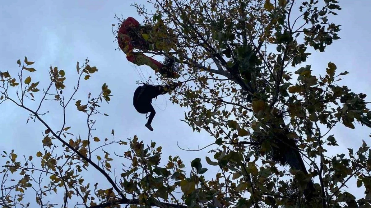 Ağaçta asılı kalan paraşütçüyü itfaiye kurtardı