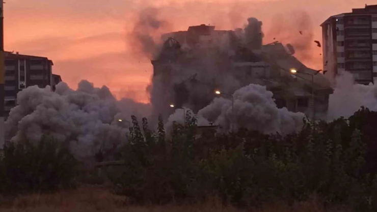 Deprem bölgesi Malatya’da ağır hasarlı 13 katlı bina, 160 kilo patlayıcı kullanılarak yıkıldı.