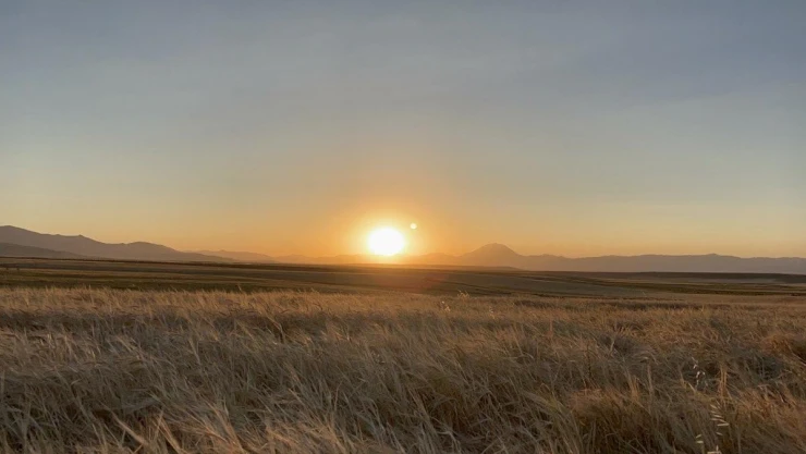 Ağrı merkez Küpkıran Mahallesi’nde bulunan Küpkıran Tepesi’nde, gün batımıyla birlikte kızıla bürünen gökyüzünde kartpostallık görüntüler oluştu. Bulutların arasından yansıyan güneş ışınları görsel bir şölen oluştururken, buğday başaklarının arasından süzülen güneş ışıkları görenleri etkiledi. Eşsiz manzarasıyla kendine hayran bırakan gün batımını izleyenler ise fotoğraf çekerek güzel anları ölümsüzleştirdi.