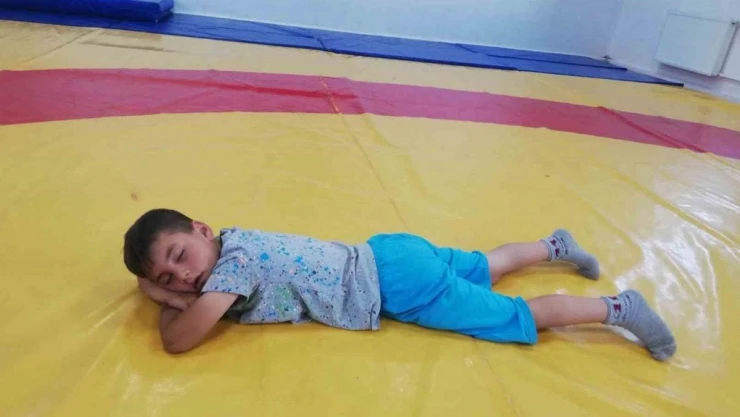 Ağrı Gençlik ve Spor İl Müdürlüğü tarafından GSB Spor Okulları kapsamında açılan güreş kursuna katılan 8 yaşındaki Salih Taşkıran, antrenmana verilen mola sırasında minderde tatlı bir uykuya daldı. Minik sporcunun dinlenmesi için antrenörler, antrenmana ara verdi.