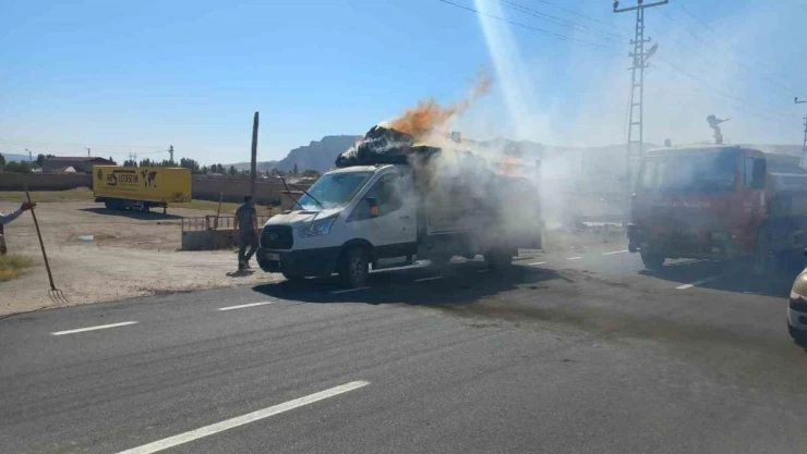 Ağrı'da saman yüklü bir kamyonet içerisinde bulunan samanlar küle döndü.