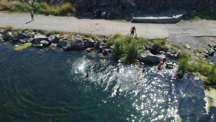 Iğdır’ın sıcaklarından bunalan gençler merkeze 30 kilometre uzaklıkta bulunan Ağrı Dağı eteklerindeki Karasu akarsuyunda serinleniyorlar.