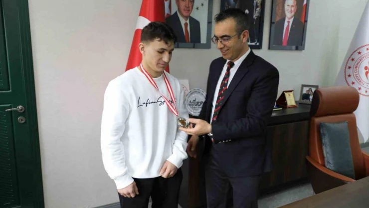 Din, başarılı sporcuya spor çantası hediye ederek, başarılarının devamını diledi. Ziyarette Spor Hizmetleri Müdürü Cemil Budak da hazır bulundu.
