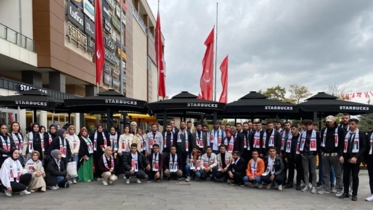 Erzurum AK Parti Gençlik Kolları, Erzurum’daki Starbucks şubesinde Filistin atkılarıyla yarım saatlik yer kapatma protestosu yaptı. Gençlik Kolları mensubu 20-30 kişilik grup sabah 10.00 sıralarında eş zamanlı olarak Starbucks şubesine giderek Filistin atkılarıyla yer kapatma eylemi gerçekleştirdi.