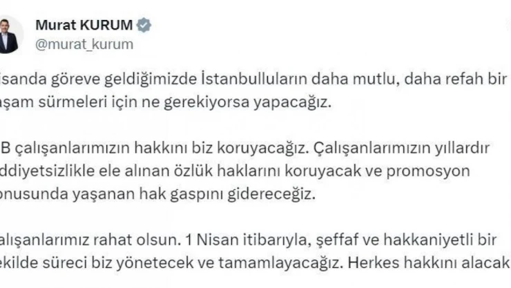 Kurum, “1 Nisan itibarıyla İstanbulluların refah içinde yaşaması için çalışacaklarını belirten Kurum, “İBB çalışanlarımızın hakkını biz koruyacağız. Çalışanlarımızın yıllardır ciddiyetsizlikle ele alınan özlük haklarını koruyacak ve promosyon konusunda yaşanan hak gaspını gidereceğiz. Çalışanlarımız rahat olsun. 1 Nisan itibarıyla, şeffaf ve hakkaniyetli bir şekilde süreci biz yönetecek ve tamamlayacağız. Herkes hakkını alacak” ifadelerini kullandı.