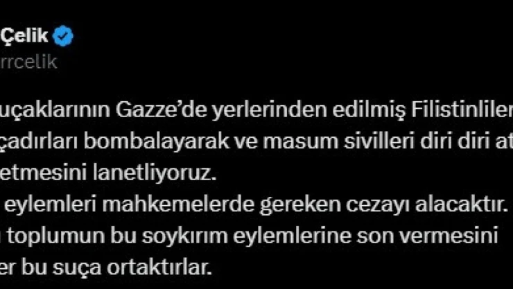 - AK Parti Sözcüsü Çelik: 'İsrail savaş uçaklarının çadırları bombalayarak masum sivilleri diri diri ateşe vererek katletmesini lanetliyoruz'