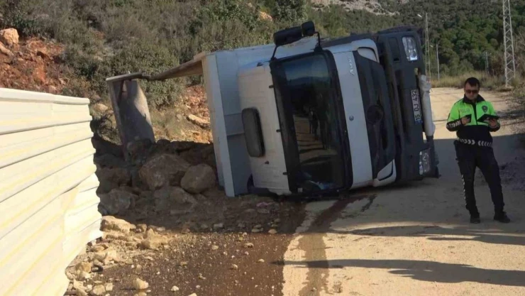 Alanya'da taş yüklü kamyon yan yattı
