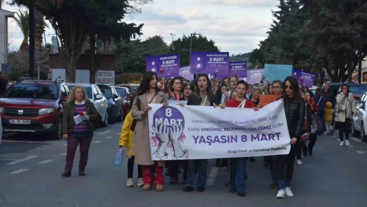 İzmir’de Aliağa Emek ve Demokrasi Platformu, 8 Mart Dünya Emekçi Kadınlar Günü dolayısıyla bir araya geldi. Demokrasi Meydanı’nda toplanan kalabalık, önce yürüyüş gerçekleştirdi daha sonra ise basın açıklaması yaptı. Yürüyüşte ’yoksulluğa, şiddete, sömürüye, gericiliğe karşı, emeğimize, bedenimize, kimliğimize sahip çıkıyoruz, yaşasın 8 Mart’ pankartı açıldı ve ’kadın, yaşam, özgürlük’, ’kadınlar yürüyor mücadele büyüyor’, ’yaşasın kadın dayanışması’ sloganları atıldı.