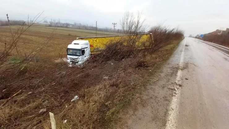 Amasya'da yağışlı yolda kontrolden çıkan tır yolun kıyısına devrildi. Tır sürücüsü kazada yaralandı.