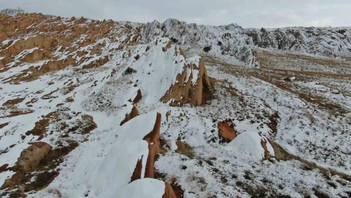 Sivas'ta rengi ve yapısıyla 'Dünyadaki Mars' olarak adlandırılan Eğribucak kayalıkları, yağan karla beyaza büründü.