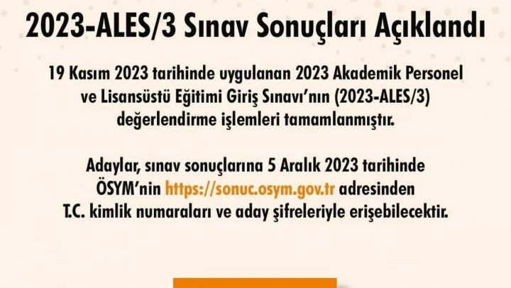 Ölçme, Seçme ve Yerleştirme Merkezi (ÖSYM) Başkanlığı, 19 Kasım 2023 tarihinde uygulanan 2023 Akademik Personel ve Lisansüstü Eğitimi Giriş Sınavı'nın (2023-ALES/3) sonuçlarının açıklandığını bildirdi.