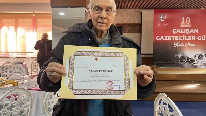 91 yaşında hâlâ gazetecilik yapan Rıdvan Uysal'a teşekkür belgesi