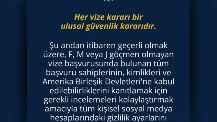 ABD Ankara Büyükelçiliği'nin sosyal medya hesabından, 'Her vize kararı bir ulusal güvenlik kararıdır' notuyla paylaştığı duyuruda, vize başvurularında kişilerin sosyal medya hesaplarının 'herkese açık' olması zorunluluğunun geldiği bildirildi. Büyükelçilik tarafından yapılan açıklamada, şu ifadeler yer aldı: