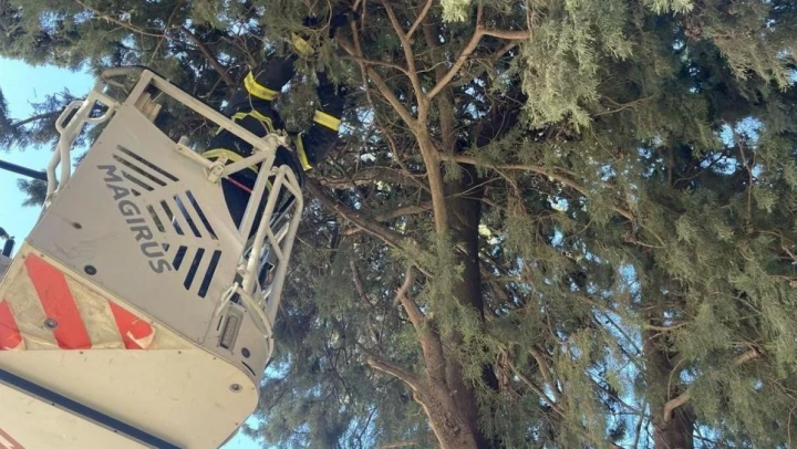 Ağaçta mahsur kalan kediyi itfaiye ekipleri kurtardı
