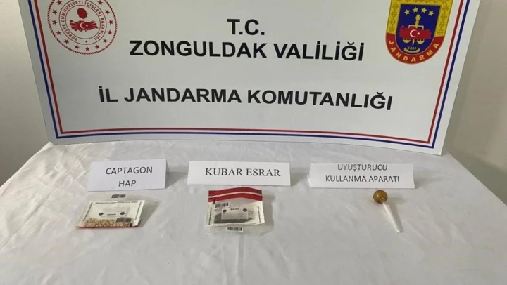 Edinilen bilgiye göre, Zonguldak'ın Alaplı İlçe Jandarma Komutanlığı ekipleri bölgede huzur ve güvenin sağlanması maksadıyla yaptığı devriyesi esnasında bir şüpheliyi durdurarak arama yaptı. Yapılan kimlik sorgusunda hakkında 'Uyuşturucu ve Uyarıcı Madde Bulundurma ve Kullanma Suçu'ndan alınan arama kararına istinaden şahsın üzerinde ve eşyasında yapılan aramada; 2,50 gr. esrar, 59 adet uyuşturucu hap ve 1 adet uyuşturucu kullanma aparatı ele geçirildi.