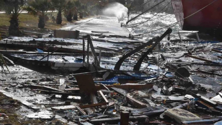 İzmir'de etkili olan fırtına sebebiyle Aliağa ilçesinde bir tekne parçalandı.