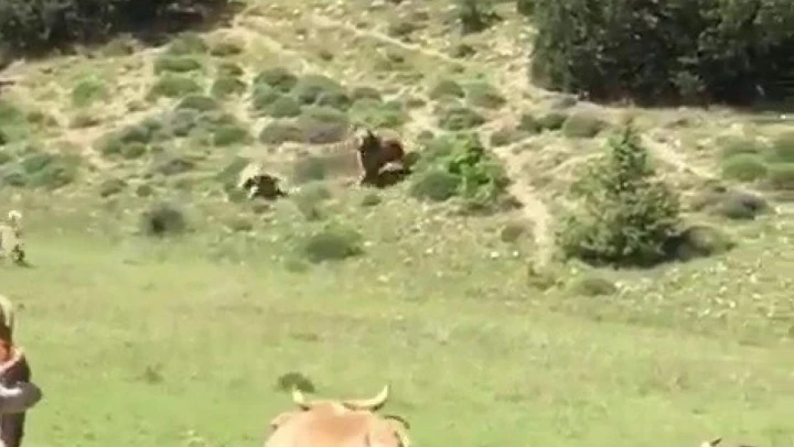 Erzurum'un Oltu ilçesinde ayının sürüye saldırısını kangal köpekleri önledi. Saldırı anı cep telefonu kamerası ile anbean görüntülendi.
