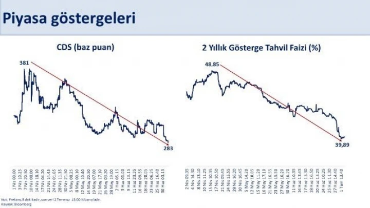 'Küresel koşulların zorluklarına rağmen ihracat, dirençli yapısını koruyor. Cari açık, öngörülerimiz doğrultusunda gerçekleşirken sürdürülebilir seviyelerde kalmaya devam ediyor. Nisan ayında 381 baz puana kadar yükselen risk primi (CDS), 283 baz puana geriledi. İki yıllık gösterge tahvil faizi ise yüzde 49'dan yüzde 40'ın altına indi. CDS ve borçlanma maliyetlerindeki düşüş, kararlı ve sabırlı duruşumuzun olumlu sonuçlarını net bir şekilde ortaya koyuyor. Dezenflasyon süreciyle birlikte yurtiçi finansal koşulların önümüzdeki dönemde daha da iyileşmesini bekliyoruz.'