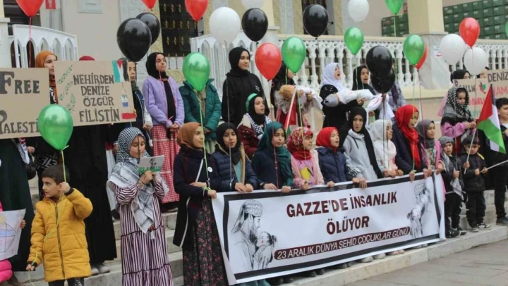Denizli'de 10 sivil toplum kuruluşunun desteğiyle Delikliçınar Yeni Camisi önünde 'Gazze'de Çocuk Olmak' konulu basın açıklaması yapıldı. 'Gazze'de İnsanlık ölüyor' yazılı pankart taşıyan onlarca çocuk, İsrail vahşetini protesto etti.