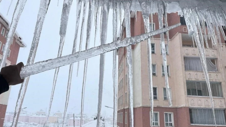 Bitlis'te etkili olan kar yağışı ve soğuk havadan dolayı çatılardaki buz sarkıtlarının boyu 2 metreyi buldu.