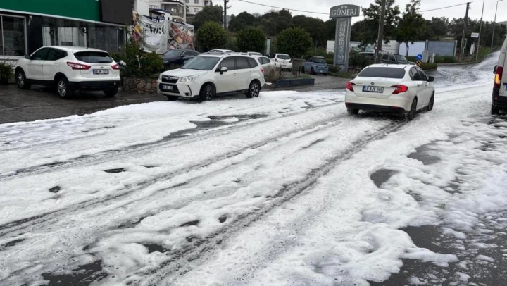Muğla'nın Bodrum ilçesinde yağmur sonrası yolda yoğun bir köpük tabakası oluştu. Bir araçtan yola dökülen deterjandan kaynaklandığı tahmin edilen köpük, belediye ekiplerince temizlendi.