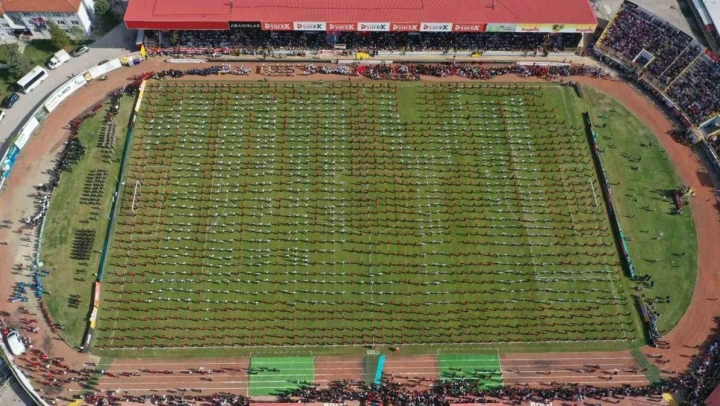 Muhteşem görüntülere sahne olan stadyumda yöresel halk oyunları, mehter gösterisi ve zeybek oyunu oynandı. İki ilkokul öğrencisinin zeybek oynayışı ise kutlama törenine katılan 15 bin kişi tarafından dakikalarca alkışlandı. Stadyuma dizilen bin 923 kişi ile dev harmandalı gösterisi yapıldı. Dronla görüntülenen muhteşem gösteride bin 923 kişi kıyafetleriyle '100. yıl' yazısını oluşturdu.
