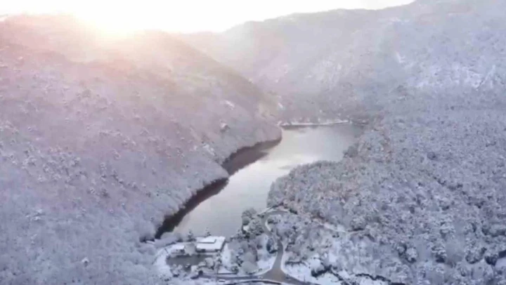Amasya'nın doğal güzelliğiyle ünlü Boraboy Gölü'nün etrafı yağan karla beyaza büründü. Kartpostallık manzara havadan dron ile görüntülendi.