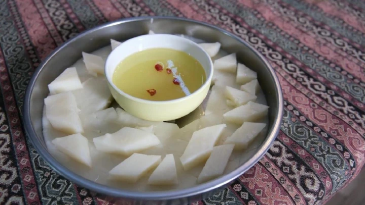 'Bol acılı, limonlu, arkasına da etini biz işte etini suda kullanmıyoruz. Etini ya kapama yapıyoruz ya tereyağında kızartıyoruz. Arkasından turşularla eti tüketiyoruz. Daha sonra tatlı olmazsa olmaz. Köy ekmekleri, bazlamalar sık sık tüketilir arapaşının ardından. Yapımı suyla hamuru kıvamını tabii ki yakalayarak pişiriyorsunuz. Tepsiye döküyorsun, dolduruyorsun. Kış içeceği, o yüzden hamuru donacak ki bıçağı vurduğumuz zaman veya tuttuğumuz zaman titreyecek. Köy tavuğu da öyle, önceden hazırlanması gerekiyor. Köy tavuğunun hazırlanması biraz zaman alıyor. Özelliği bu.'