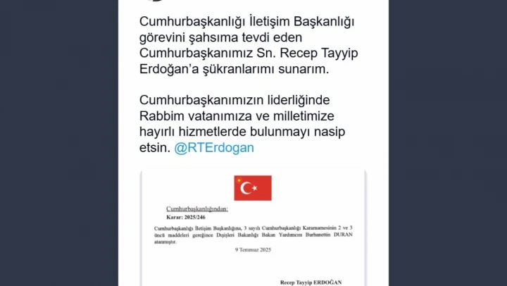 Cumhurbaşkanlığı İletişim Başkanlığı görevine Dışişleri Bakan Yardımcısı Burhanettin Duran getirildi. 9 Temmuz 2025 tarihli ve 2025/246 sayılı Cumhurbaşkanlığı Kararı ile Dışişleri Bakan Yardımcısı Burhanettin Duran, 3 sayılı Cumhurbaşkanlığı Kararnamesi'nin 2 ve 3'üncü maddeleri uyarınca Cumhurbaşkanlığı İletişim Başkanı olarak görevlendirildi.