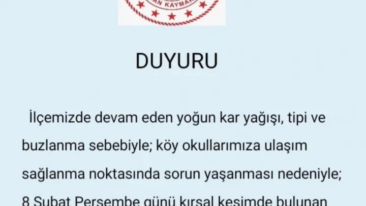 Çaldıran Kaymakamlığı sosyal medya hesaplarından yaptığı paylaşımda, 'İlçemizde devam eden yoğun kar yağışı, tipi ve buzlanma sebebiyle kırsal mahalle okullarımıza ulaşım sağlanması noktasında sorun yaşanmaması nedeniyle 8 Şubat 2024 Perşembe günü köy okulları ve taşımalı eğitim çerçevesindeki öğrenciler için eğitim-öğretime 1 gün süre ile ara verilmiştir' denildi.