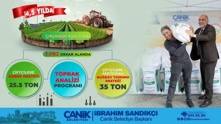 Samsun'un Canik Belediye Başkanı İbrahim Sandıkçı, 4,5 yılda ilçedeki çiftçilere yüzde 100 destek verdiklerini vurguladı. '4,5 yılda çiftçilerimize sağladığımız destekler ve toprak analizi çalışmalarımızla, Canik'i tarımsal üretimde öncü konuma getirdik' diyen Başkan İbrahim Sandıkçı, 4,5 yıl içerisinde ilçedeki çiftçilere 3 bin 82 dekar alanı kapsayan 25,5 ton gübre, 35 ton sertifikalı buğday tohumu desteği verdiklerini ifade etti.