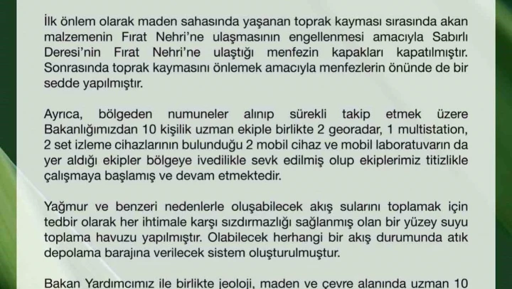 'Olabilecek herhangi bir akış durumunda atık depolama barajına verilecek sistem oluşturulmuştur. Bakan yardımcımız ile birlikte jeoloji, maden ve çevre alanında uzman 10 bilim insanı ile sahada çalışmalar sürdürülmektedir. İlk andan itibaren Sabırlı ve Çöpler dereleri ve Fırat Nehri boyunca belirlenmiş noktalardan rutin olarak anlık numuneler alınmaya başlanmış ve takibi yapılmaktadır. Şu an için bir kirlilik tespit edilmemiştir.'