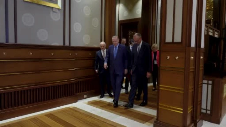 Almanya Başbakanı Friedrich Merz'in içinde bulunduğu makam aracını Cumhurbaşkanlığı Külliyesi'nin önündeki caddede karşılayan süvariler, Merz'e protokol kapısına kadar eşlik etti. Cumhurbaşkanı Erdoğan, Almanya Başbakanı Friedrich Merz'i Cumhurbaşkanlığı Külliyesi'nin ana giriş kapısında karşıladı. Cumhurbaşkanı Erdoğan ve Merz'in tören alanındaki yerlerini almalarının ardından 21 pare top atışı eşliğinde iki ülkenin milli marşları çalındı. Merz, Muhafız Alayı Tören Kıtası'nı 'Merhaba asker' diyerek selamladı. Törende tarihte kurulan 16 Türk devletini temsil eden bayraklar ve askerler de yer aldı. Heyetlerini birbirine takdim eden Erdoğan ve Merz, merdivenlerde Türkiye ve Almanya bayrakları önünde gazetecilere poz verdi. Daha sonra baş başa görüşmeye geçen Erdoğan ve Almanya Başbakanı Merz, ikili ve heyetler arası gerçekleştirecekleri görüşmelerin ardından ortak basın toplantısı gerçekleştirecek.